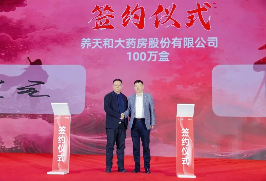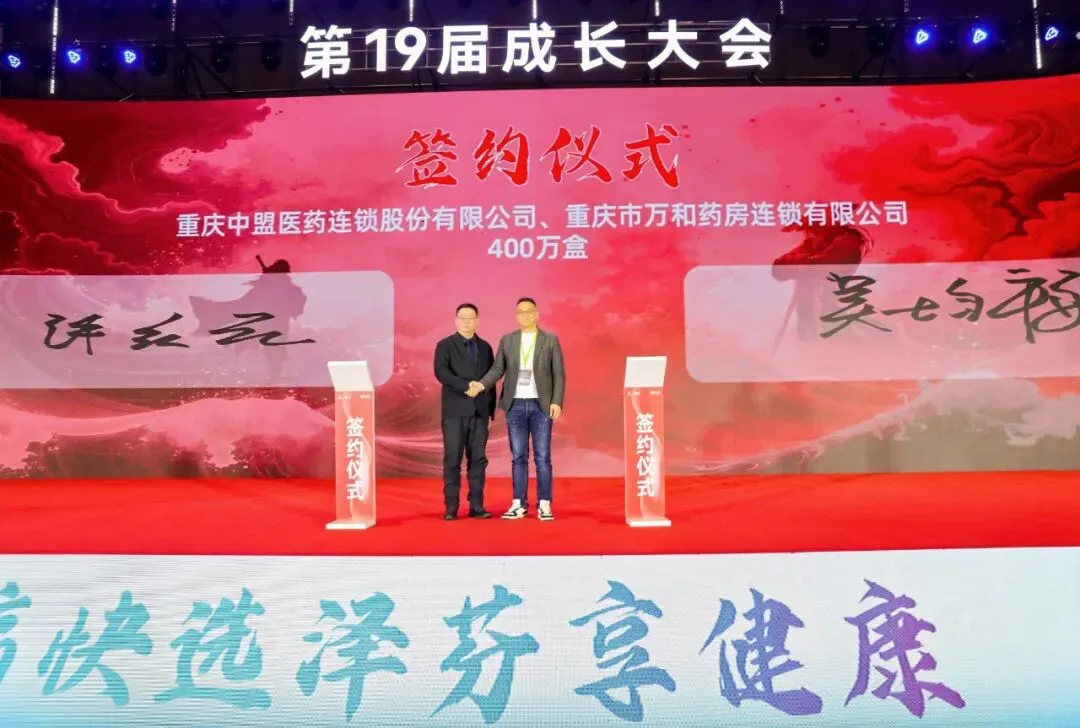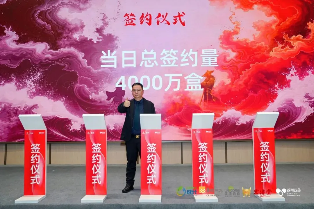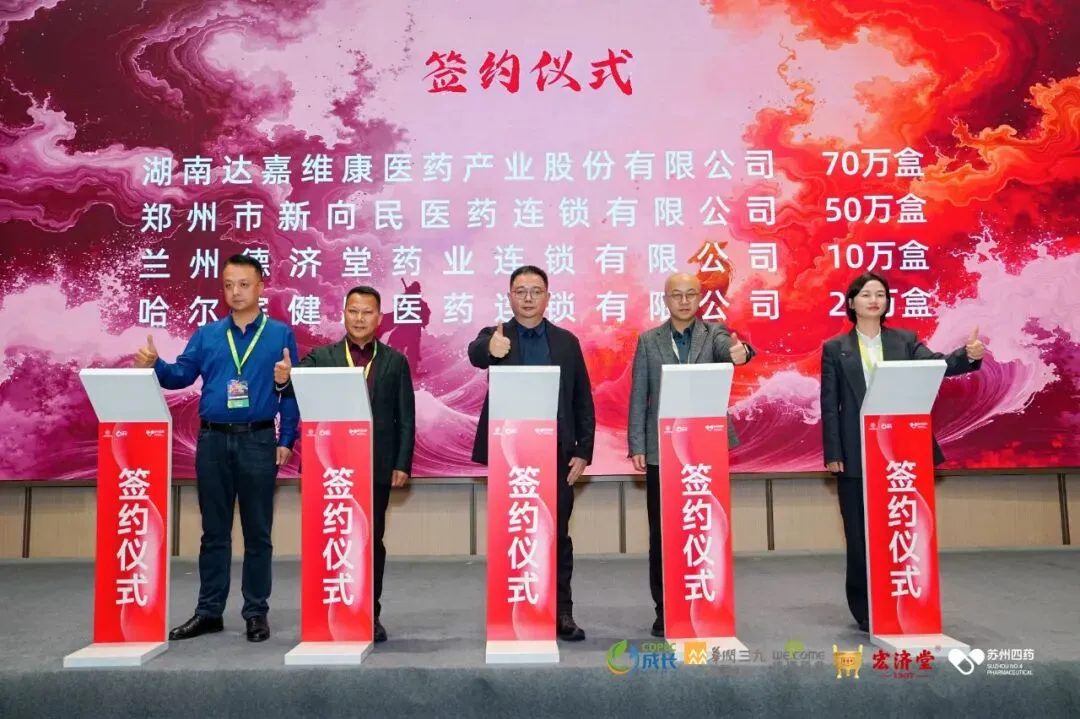 致辞环节后,本次午宴的核心亮点“泽芬英雄联盟会”签约仪式在全场嘉宾的热切关注与期待中正式启幕。苏州四药与益丰大药房、一心堂、漱玉平民、全亿健康、德生堂、养天和、燕喜堂、中盟等全国40多家重点连锁企业当日依次签约,达成年度总销量4000万盒的战略合作共识,共推泽芬右布洛芬胶囊这一黄金大单品。