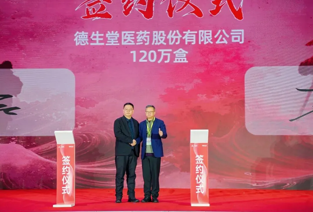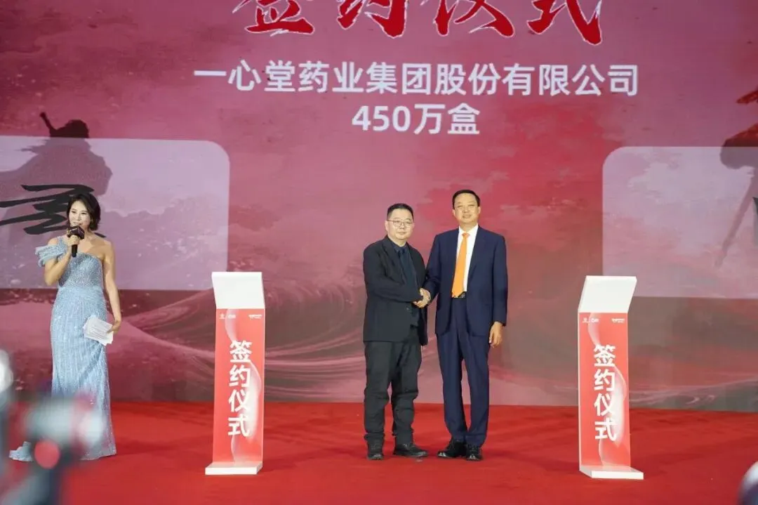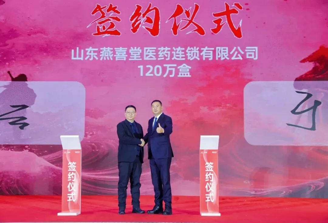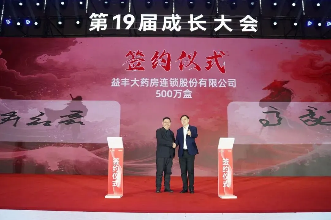 致辞环节后,本次午宴的核心亮点“泽芬英雄联盟会”签约仪式在全场嘉宾的热切关注与期待中正式启幕。苏州四药与益丰大药房、一心堂、漱玉平民、全亿健康、德生堂、养天和、燕喜堂、中盟等全国40多家重点连锁企业当日依次签约,达成年度总销量4000万盒的战略合作共识,共推泽芬右布洛芬胶囊这一黄金大单品。